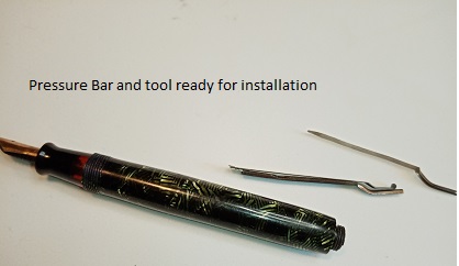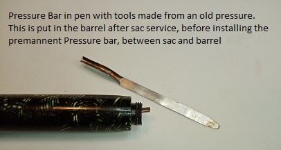 The correct method of installing a pressure bar is on servicing to remove the Button and from the barrel end then pull out the pressure bar, then remove the section and old sac etc, to service the pen.