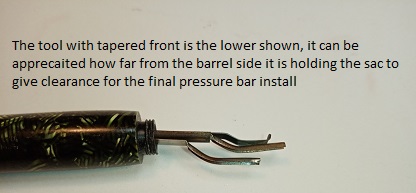 After re-sac and assembly of the section in the barrel the Pressure Bar has to be installed form the rear. This has to be between the barrel and the sac, not too easy with 3 part “hanging” pressure. These are my favoured type as they do not rely on pressure to the section end, or as in very early Parker pens a ring to sit on inside the barrel. The “hanging type as shown are more substantial so can create problems with installation to clear between the barrel and sac.