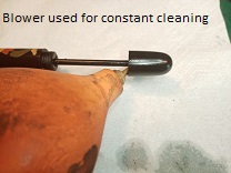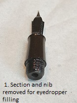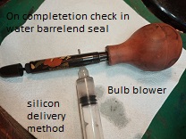 Most importantly after carrying out any pen works is to check your works. Prior to filling with ink to check, I use a blower again, this time one that fits and seals over the section, with the barrel end immersed in water, checking no air bubbles on depression of the bulb blower. As with sac’d pens the slightest pin prick of air ingress will cause ink to “flood” on writing. Very important on testing a pen after servicing, is to fill with ink for writing, not simply dip testing the nib.